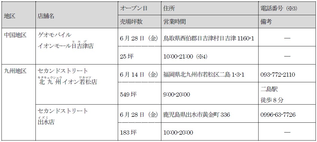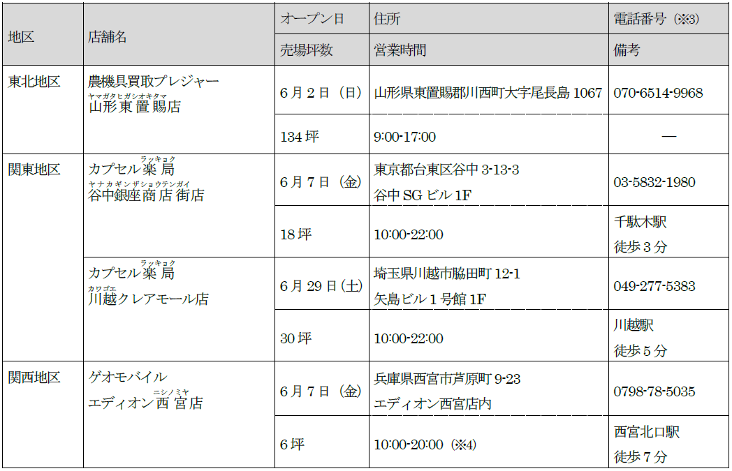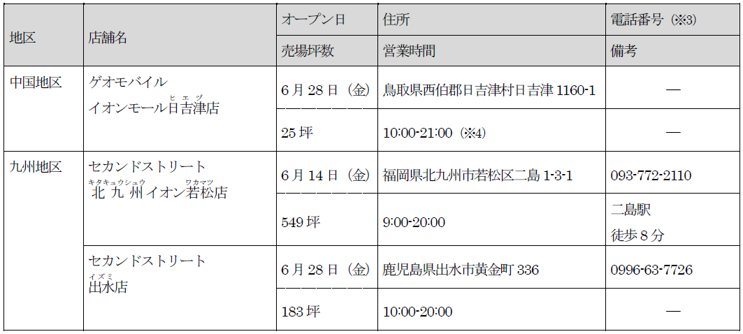 新たに「セカンドストリート」2店舗、「ゲオモバイル」2店舗、「カプセル楽局」2店舗、「プレジャー」1店舗などの、合計8店(※2)が2024年度6月度に新たにオープンします。