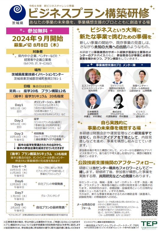 茨城県産業技術イノベーションセンターでは、ビジネス創出に意欲的な県内事業者に対し、ビジネスプラン構築の伴走支援を行う研修を実施しております。本研修では、参加者が、専門家(起業家、弁護士、コンサル等)や当センター職員の助言を受けながら、自身のビジネスアイデアをビジネスプランに練り上げました。
