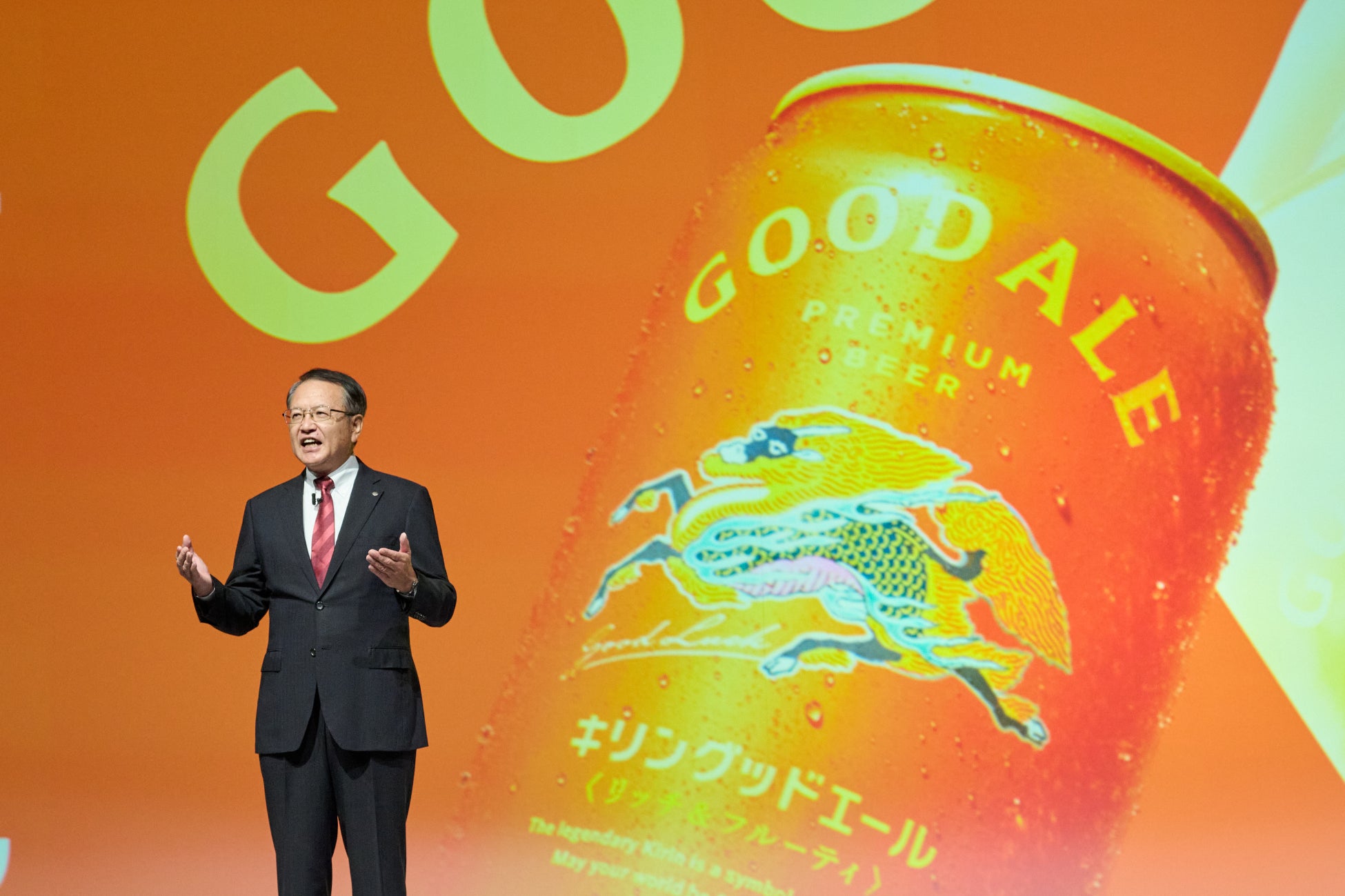 社長の堀口英樹が登壇し、新ブランド「キリングッドエール」についてプレゼンテーションを行い、「日本の未来が明るくなる、いいビールをつくりたい」という強い思いから生まれた、キリンの次世代定番ビールである意気込みを述べました。