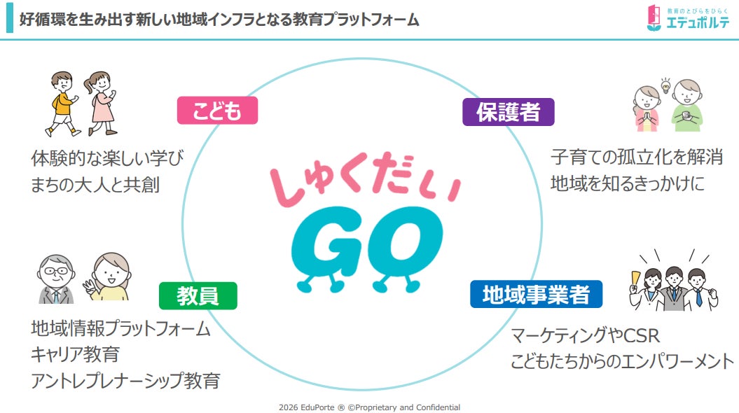EduPorte株式会社(本社:福岡県福岡市、代表:宮崎麻世)は、「しゅくだいGO」を通じて、まちをまるごと学びのフィールドに変え、すべての人がわかり合い、分かち合う社会をつくる夢に向かって歩みを進めています。