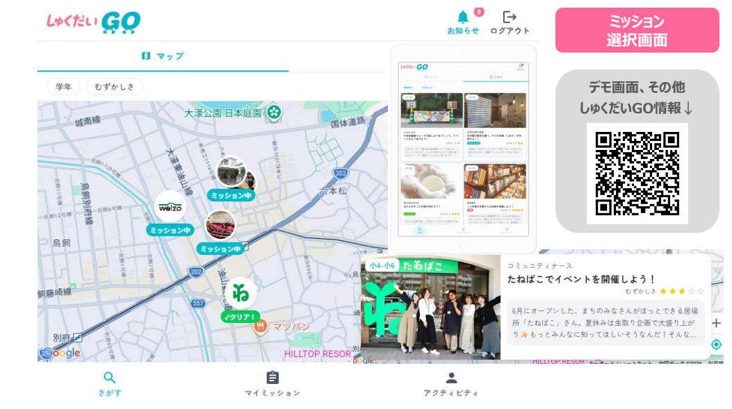 「しゅくだいGO」では、こどもたちがウェブアプリを通じて、地域の企業や事業者が出す「ミッション」に挑戦します。