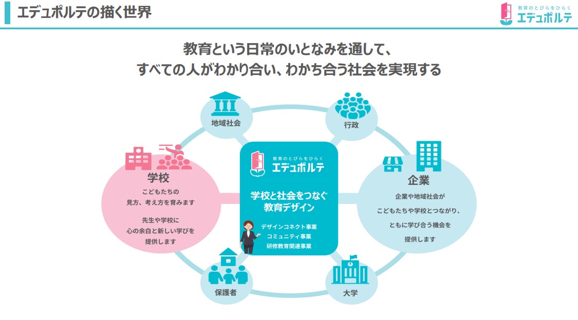また、教員にとっては地域情報プラットフォームやキャリア教育・アントレプレナーシップ教育の土台となり、地域事業者にとってはマーケティングやCSR、さらにはこどもたちからのエンパワーメントにもつながります。