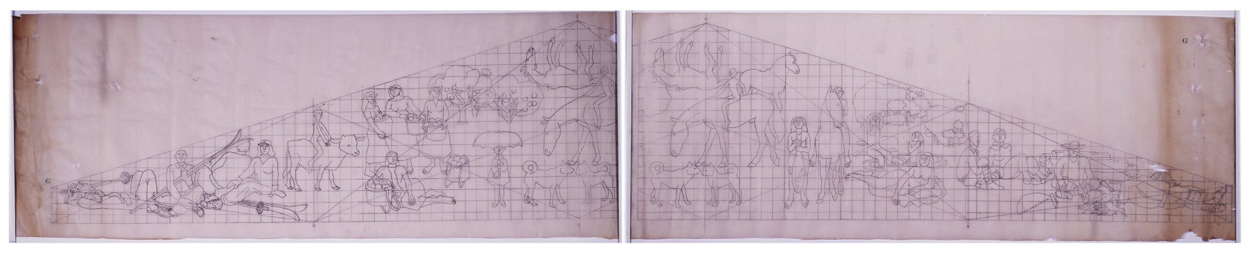 壁画《自由》が制作された経緯、当時の制作の様子、絵に込められた作者の思いなどを下絵や資料でご紹介します。