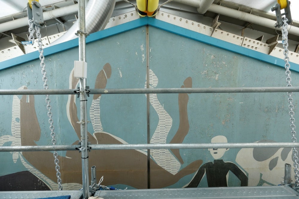 物資不足で適した材料が調達できなかった制作当時の事情と、駅という開かれた環境によって、この壁画は傷みやすく、これまで三度修復が施され、存続が図られてきました。2025年5月に始まった三度目の修復では、壁画前に設置された「『自由』を修復しています」という横断幕が意味深長とSNSで話題になり、壁画自体も注目されました。