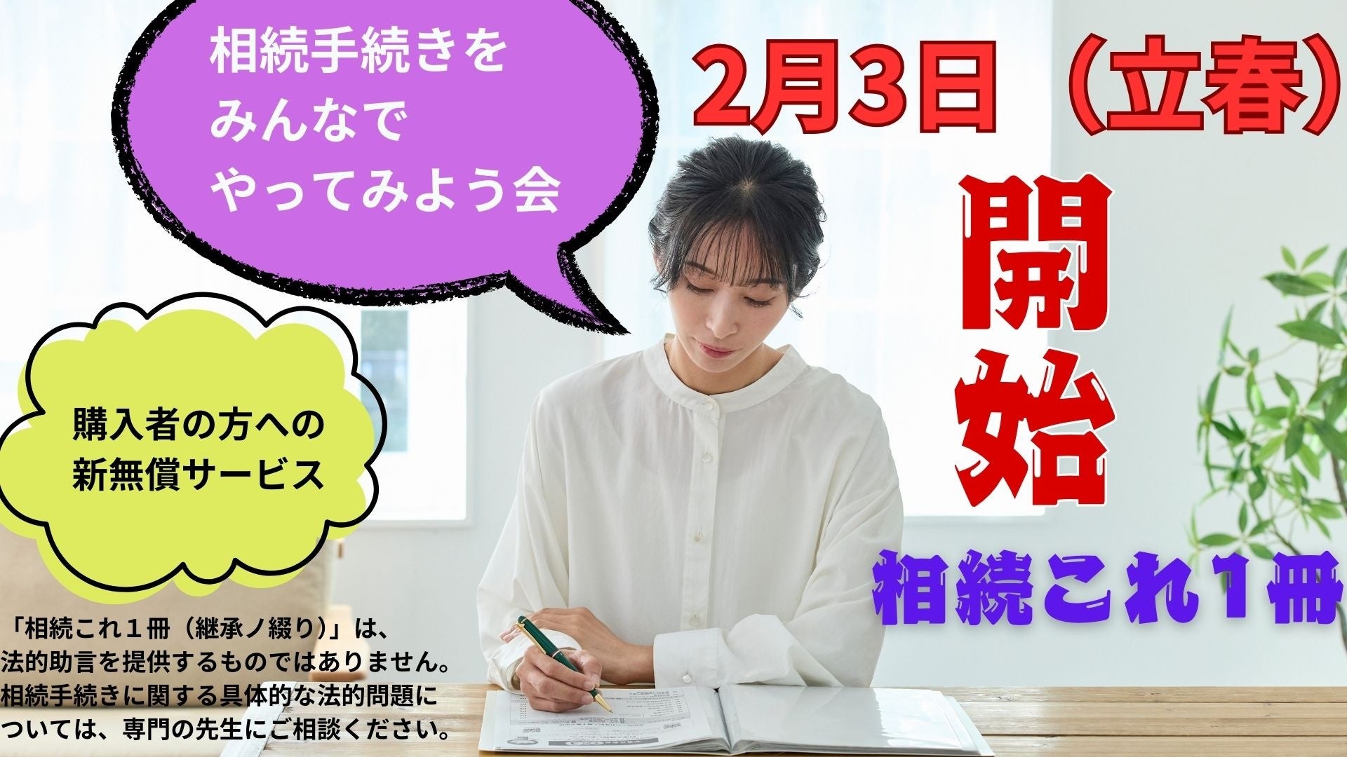 相続手続きみんなでやってみよう会は、皆様で商品を開き進めていくになります、購入者に特化しています。全国購入者であれば全ての方が対象と予定しており、2025年2月3日(立春)からサービスを開始します。