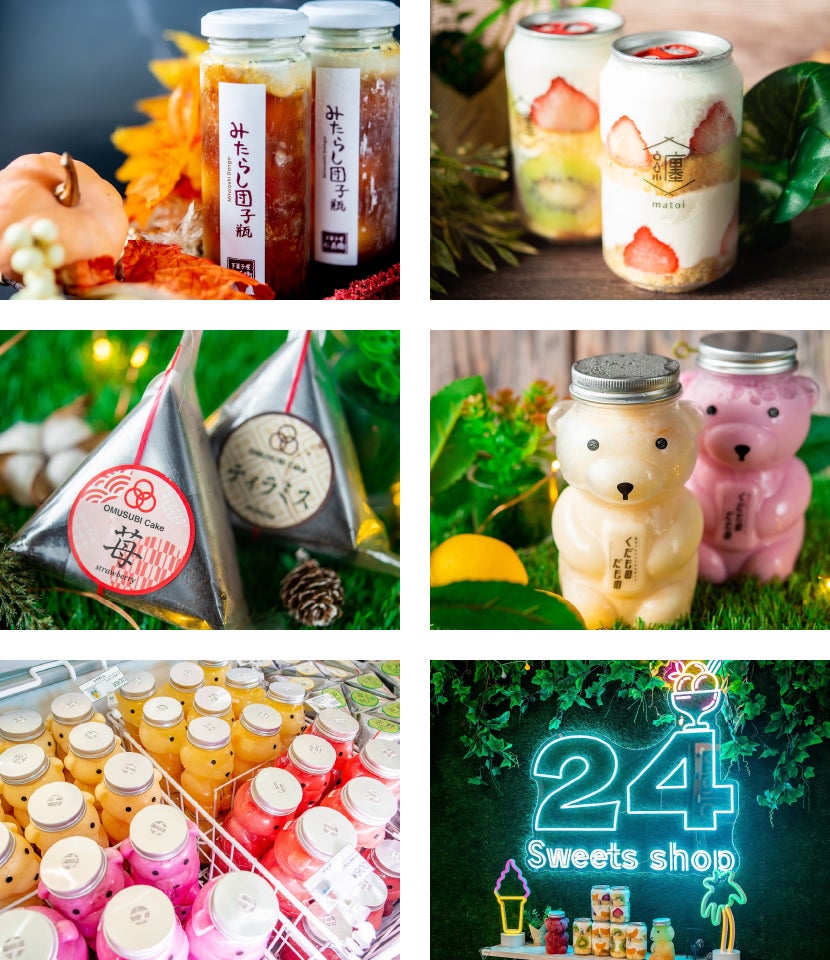 「24スイーツショップ」では、コンビニやスーパーには並ばない映えスイーツ「団子瓶」「おむすびケーキ」「ショートケーキ缶」など、全国各地の人気スイーツを100種類近く取り揃えており、思わずSNSに投稿したくなるような空間でいつでも楽しく、そしてリーズナブルに買い物ができます。また、季節限定スイーツなど、商品の入れ替えも日々行っているため、いつお店を訪れても新しいスイーツとの出会いが実現できる工夫をしております。