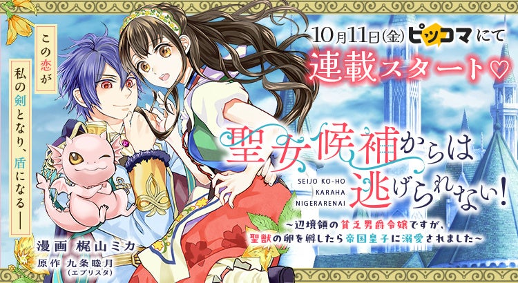 株式会社エブリスタ(本社:東京都千代田区、代表取締役社長:安藤晃義)は、女性向けコミックレーベル「ネクストf Lian(リアン)」にて新作『聖女候補からは逃げられない! ~辺境領の貧乏男爵令嬢ですが、聖獣の卵を孵したら帝国皇子に溺愛されました~』を連載開始。2024年10月11日(金)よりピッコマにて先行配信を開始いたします。