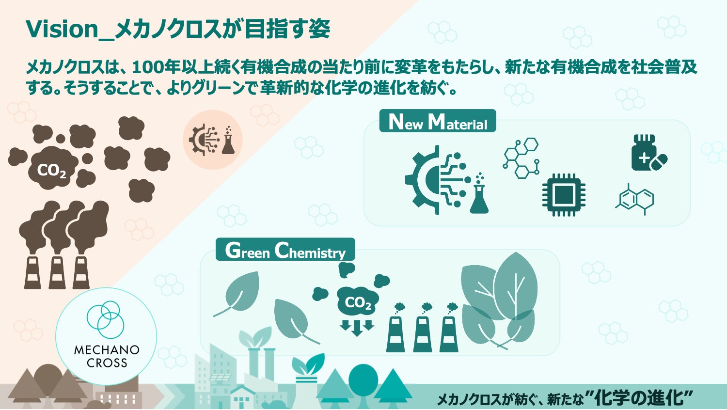 「メカノクロスは、100年以上続く有機合成の当たり前に変革をもたらし、新たな有機合成を社会普及する。そうすることで、よりグリーンで革新的な化学の進化を紡ぐ。」