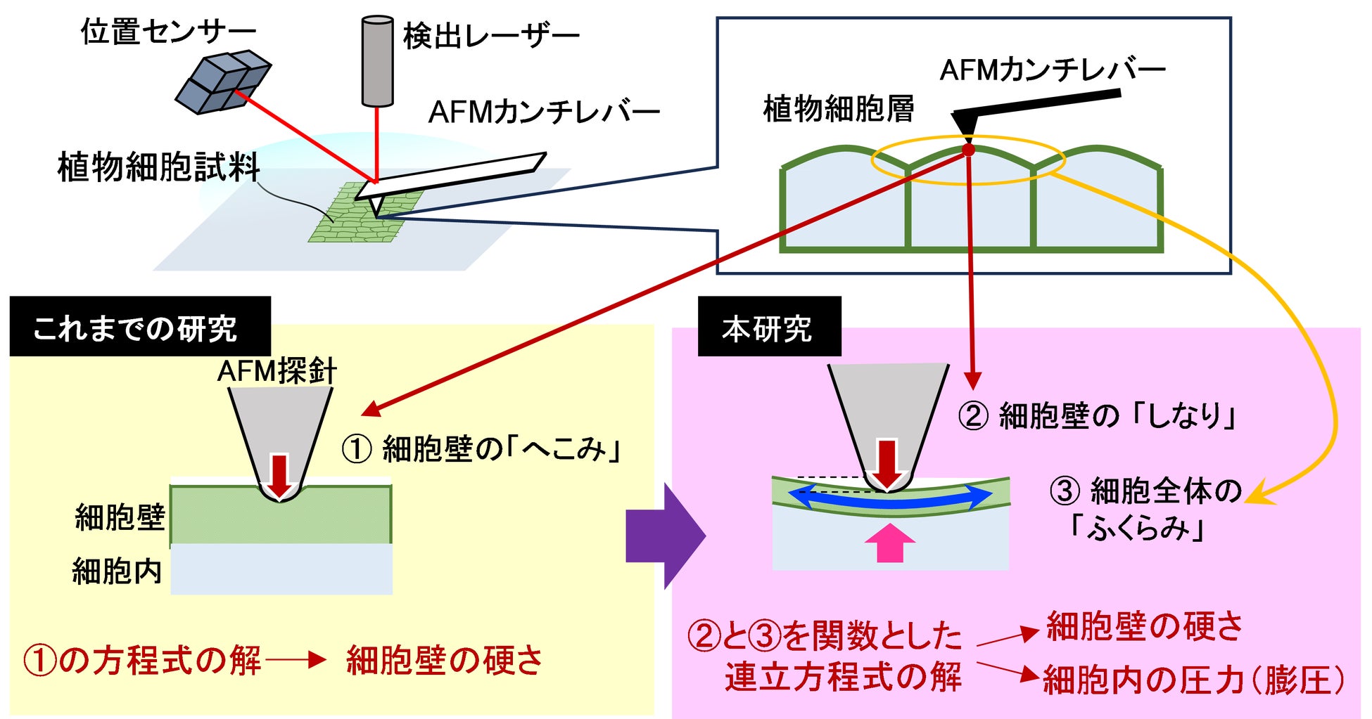 本研究では、細胞表面の硬さなど構造的な特性を高精度に調べられる原子間力顕微鏡(AFM、注2)を用いて植物細胞の見かけの硬さとふくらみを計測し、その計測値を細胞壁の硬さと膨圧の定量値に変換することに成功しました(図1)。これまで、生きた細胞の膨圧を測定するには微小な針を細胞に突き刺すという極めて難しい手法が一般的でした。また、細胞壁の硬さは、死んだ細胞の細胞壁を力学的に測定する手法が取られていました。