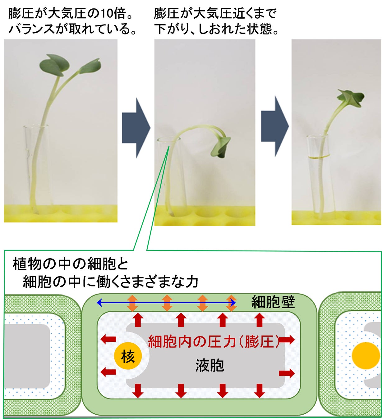 骨をもたない植物は、細胞壁をもつ硬い細胞がブロックのように積み重なり形作られています。しかし、植物細胞がその形を維持するためには、細胞壁の硬さだけでなく、細胞を内側から満杯にまで膨らませる圧力(膨圧)をもたないとなりません。植物細胞は膨圧が高いとき固くなり、正常な植物のなかの細胞の膨圧は、なんと大気圧の10倍(10気圧)にもなると言われています。一方で細胞は、水や栄養がなくなった状態では、膨圧を大気圧近くまで下げて、しおれた状態となり、生きるためのエネルギーを節約します(図2)。もちろん、植物細胞が硬くなったり、柔らかくなったりするためには、細胞壁がほどよい硬さをもっていないといけません。このような細胞壁の硬さと膨圧のバランスを知ることは、植物が形作られる生い立ちの過程や、それに伴う変化を知るうえでの本質的な問題です。このため、本研究では、これまで出来なかった生きた植物細胞の細胞壁の硬さと膨圧同時に調べる方法を考案しました。