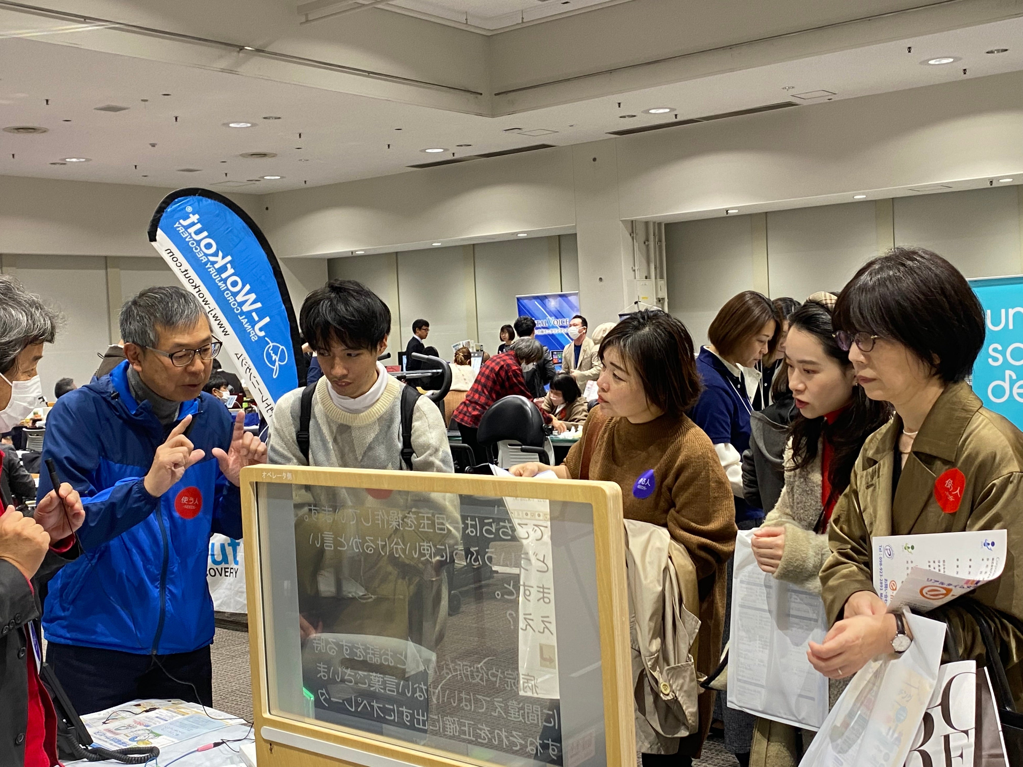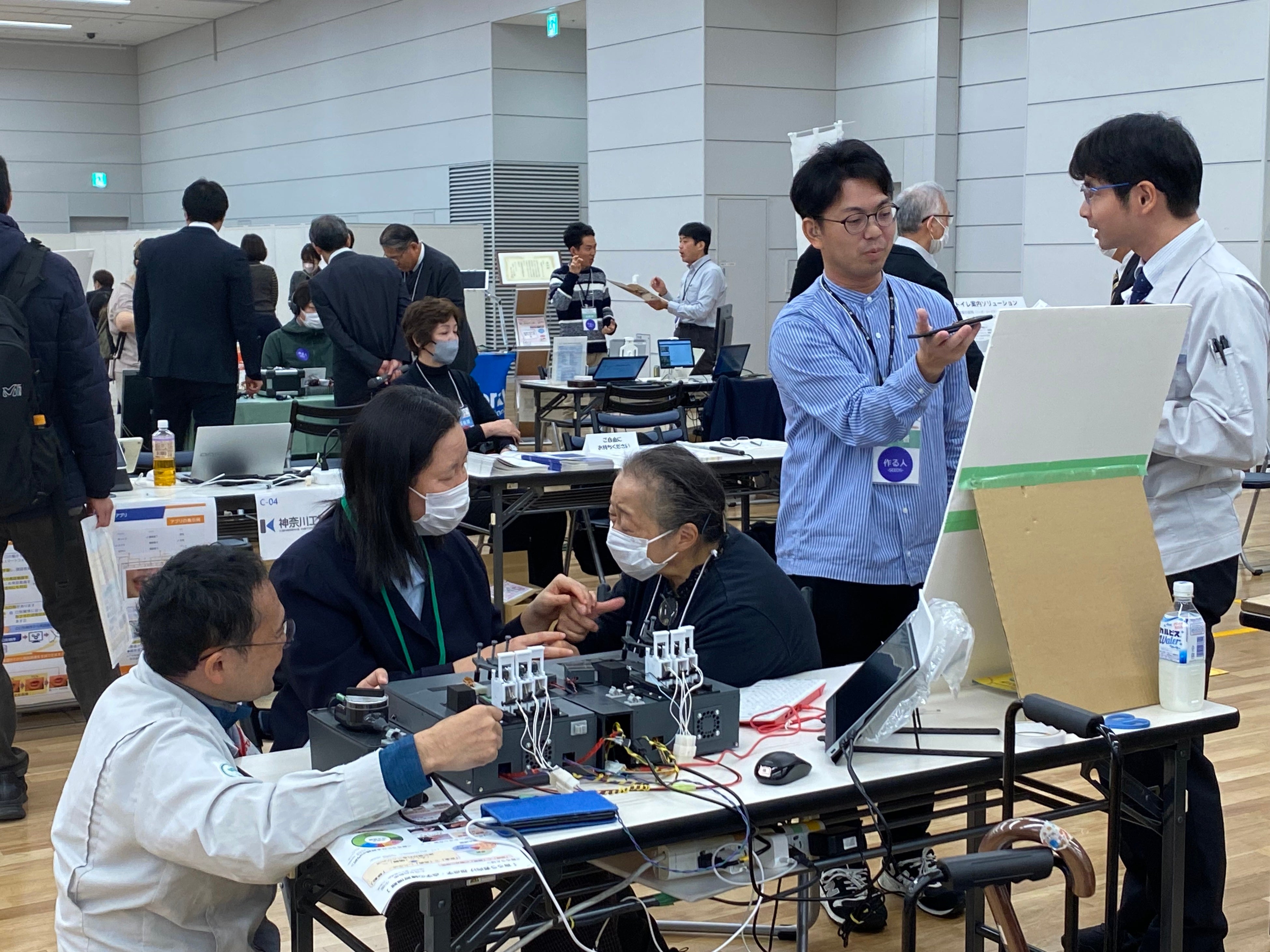 試作段階の支援機器を囲み、実際に試しながら、当事者と開発者が直接意見を交わせる貴重な場です。