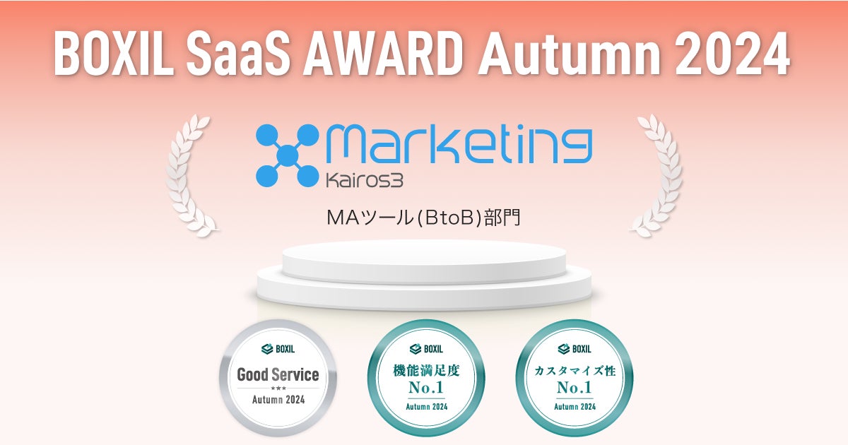 売上アップを仕組みで実現するCRM「Kairos3(カイロススリー)」を開発・提供するカイロスマーケティング株式会社(本社:東京都渋谷区、代表取締役:佐宗 大介、以下「当社」)は、「Kairos3」のツールの1つであるマーケティングオートメーションツール「Kairos3 Marketing」が、「BOXIL SaaS AWARD Autumn 2024」のMAツール(BtoB)部門にて「Good Service」「機能満足度No.1」「カスタマイズ性No.1」を受賞したことをお知らせします。