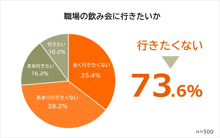 社会人500人に「職場の飲み会に行きたいですか」と聞いたところ、行きたくないという人が73.6%にのぼりました。