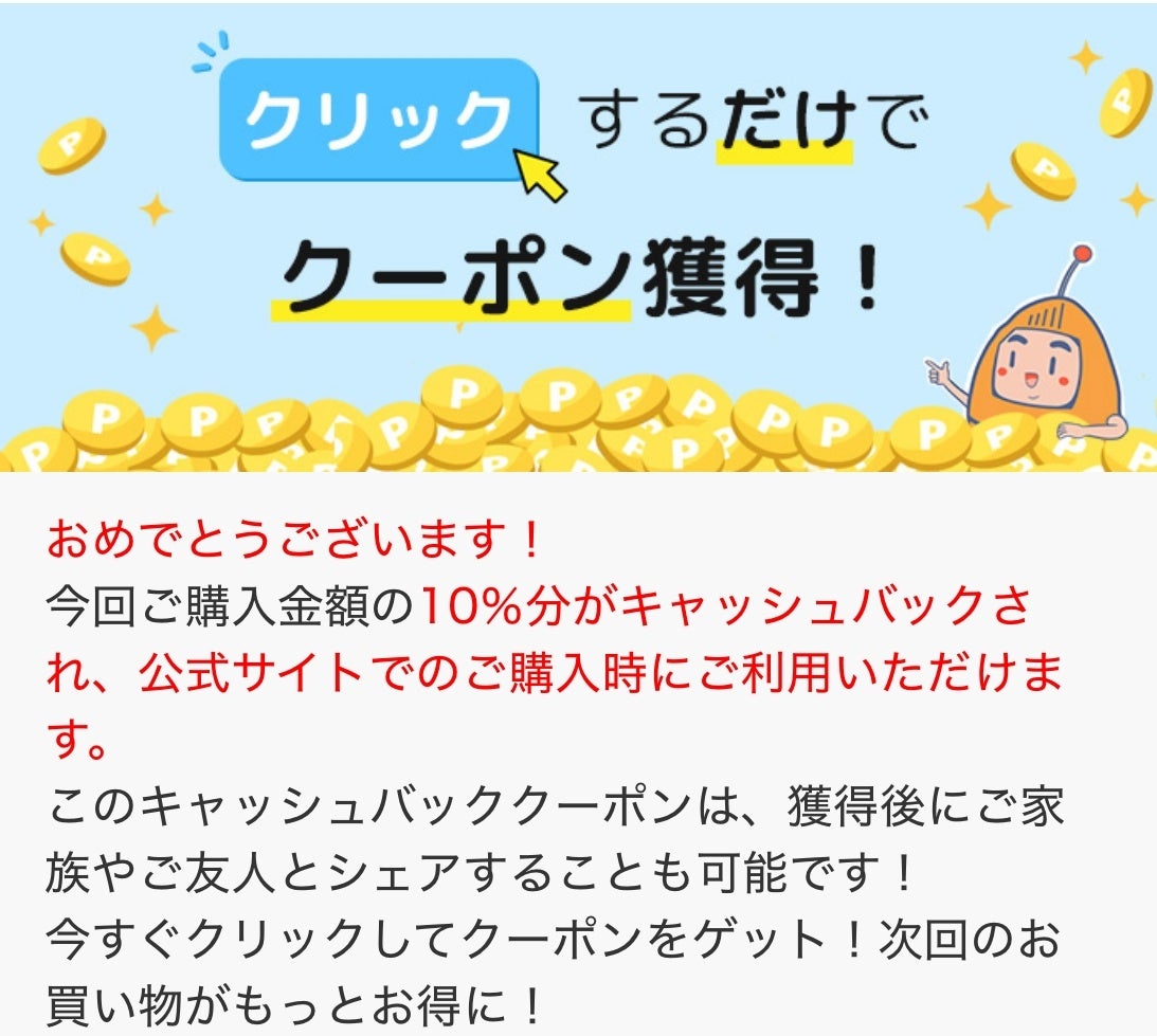 キャッシュバック方法:次回購入時に使用可能なクーポンとして送付