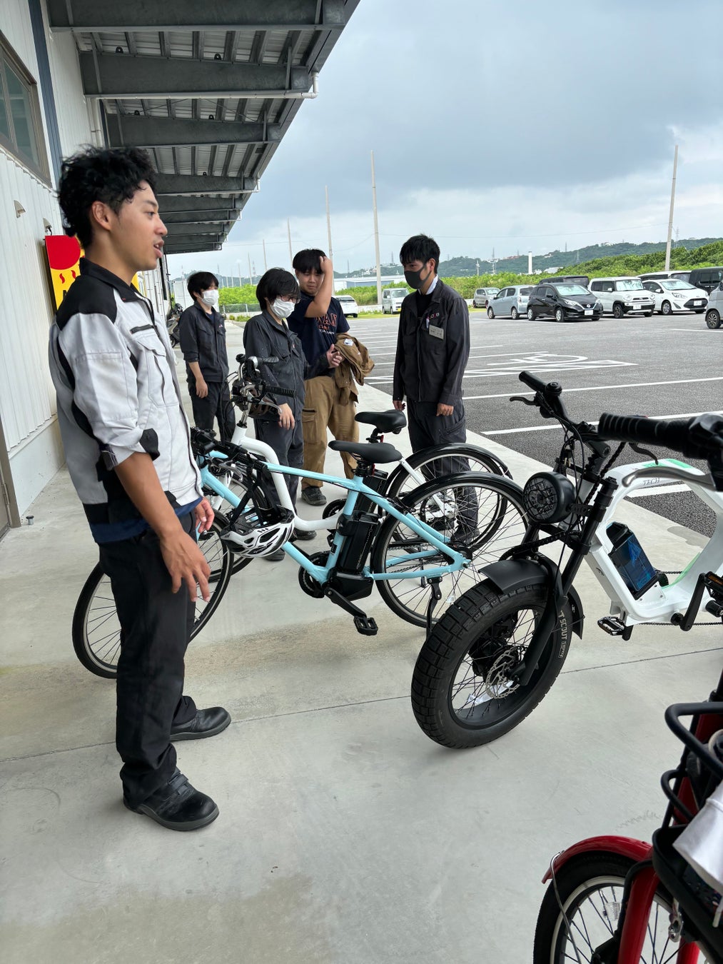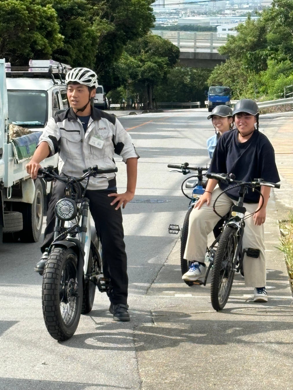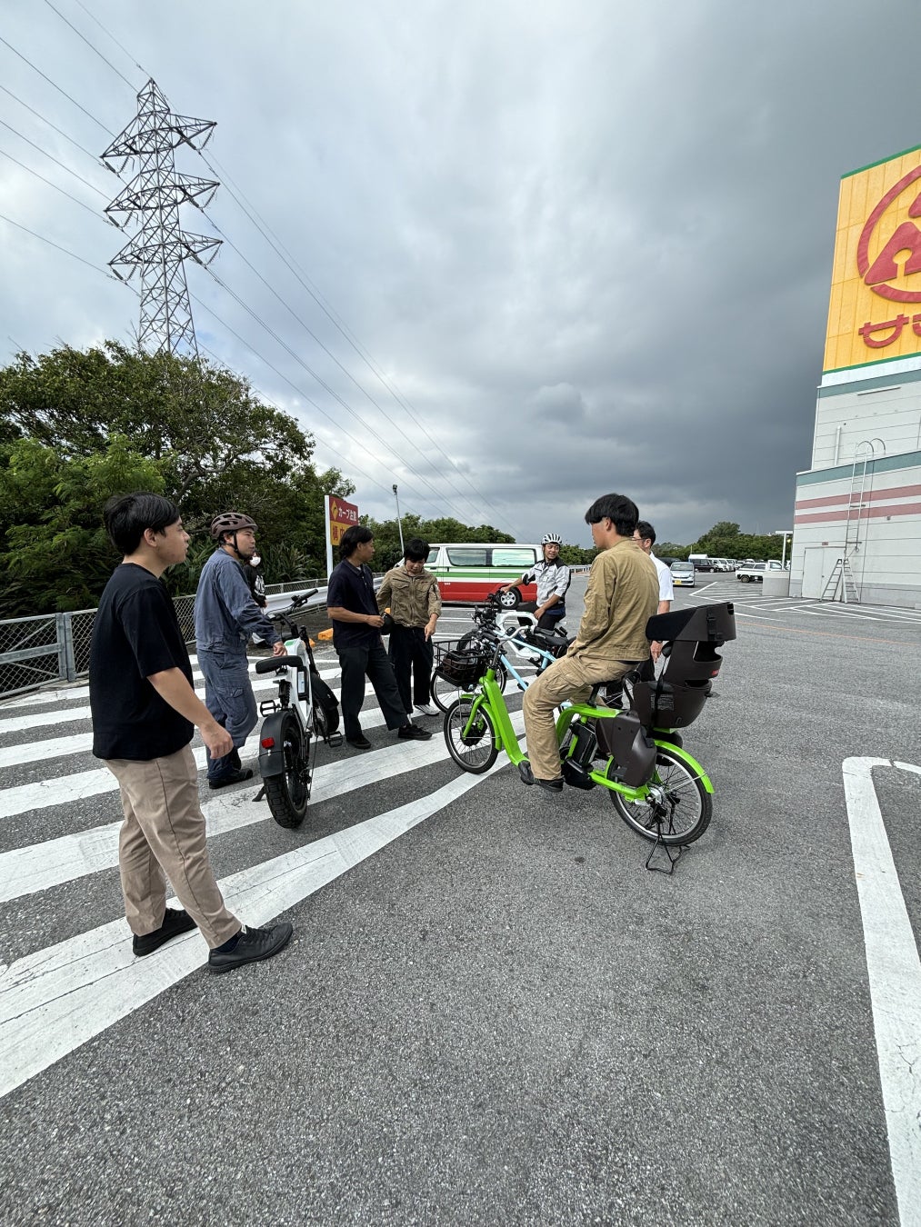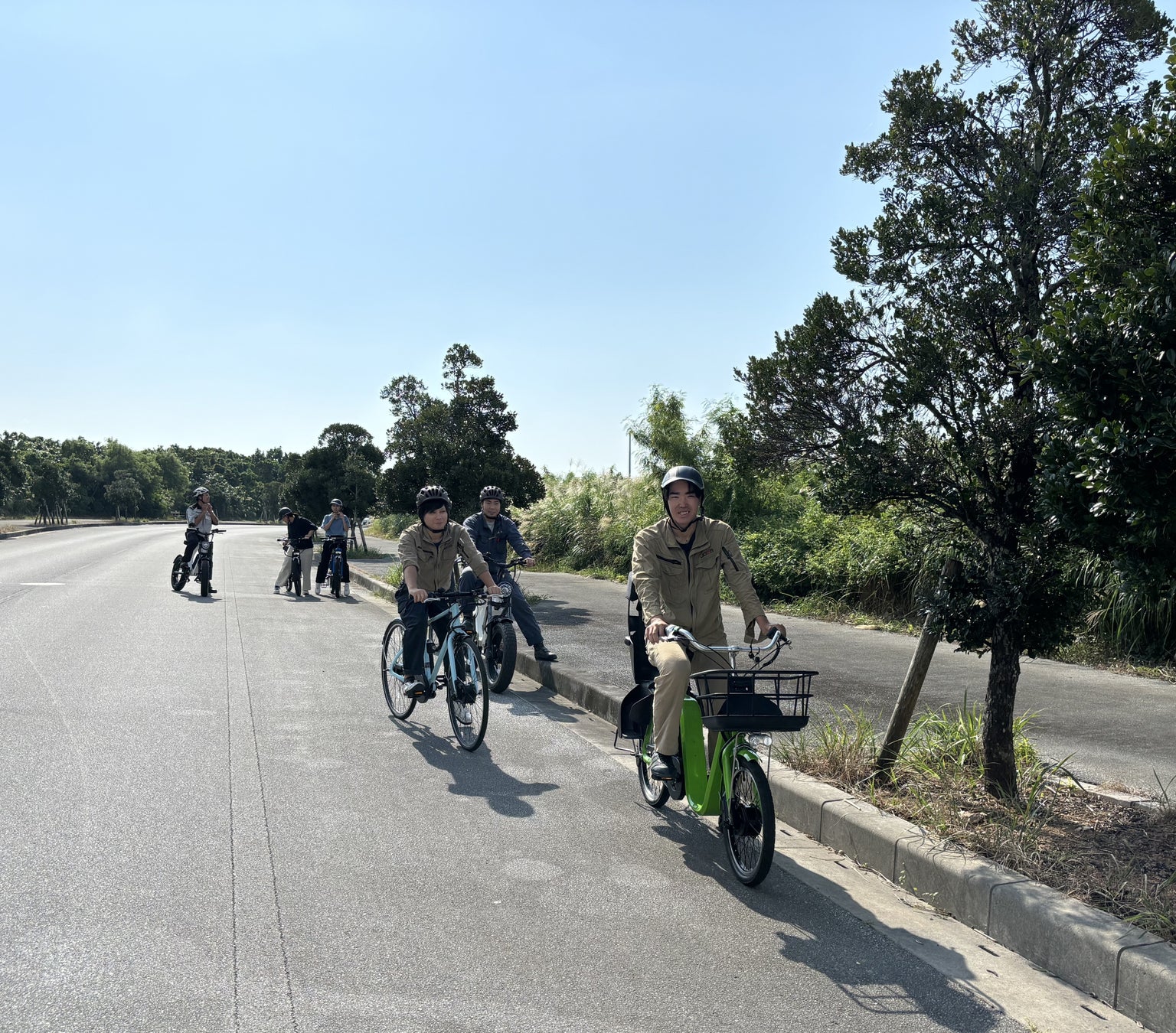 今回の訓練では、従来、消防署から推奨されている徒歩での避難方法に加え、うるま市からの許可を得ることで当社独自の取り組みとして、電動アシスト自転車を使用した避難も実施しました。