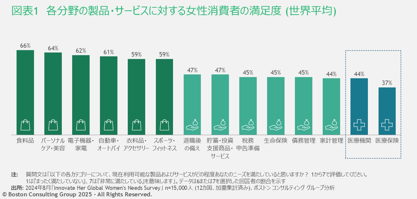 調査会社ニールセンによると、女性は世界の消費支出の約32兆ドルを管理しており、今後5年以内に世界の裁量支出の75%を管理すると予測されています。しかし、BCG Xの調査から、消費財、医療、金融などの主要分野において、女性は製品やサービスが自分たちのニーズを満たしていないと考えていることがわかりました(図表1)。