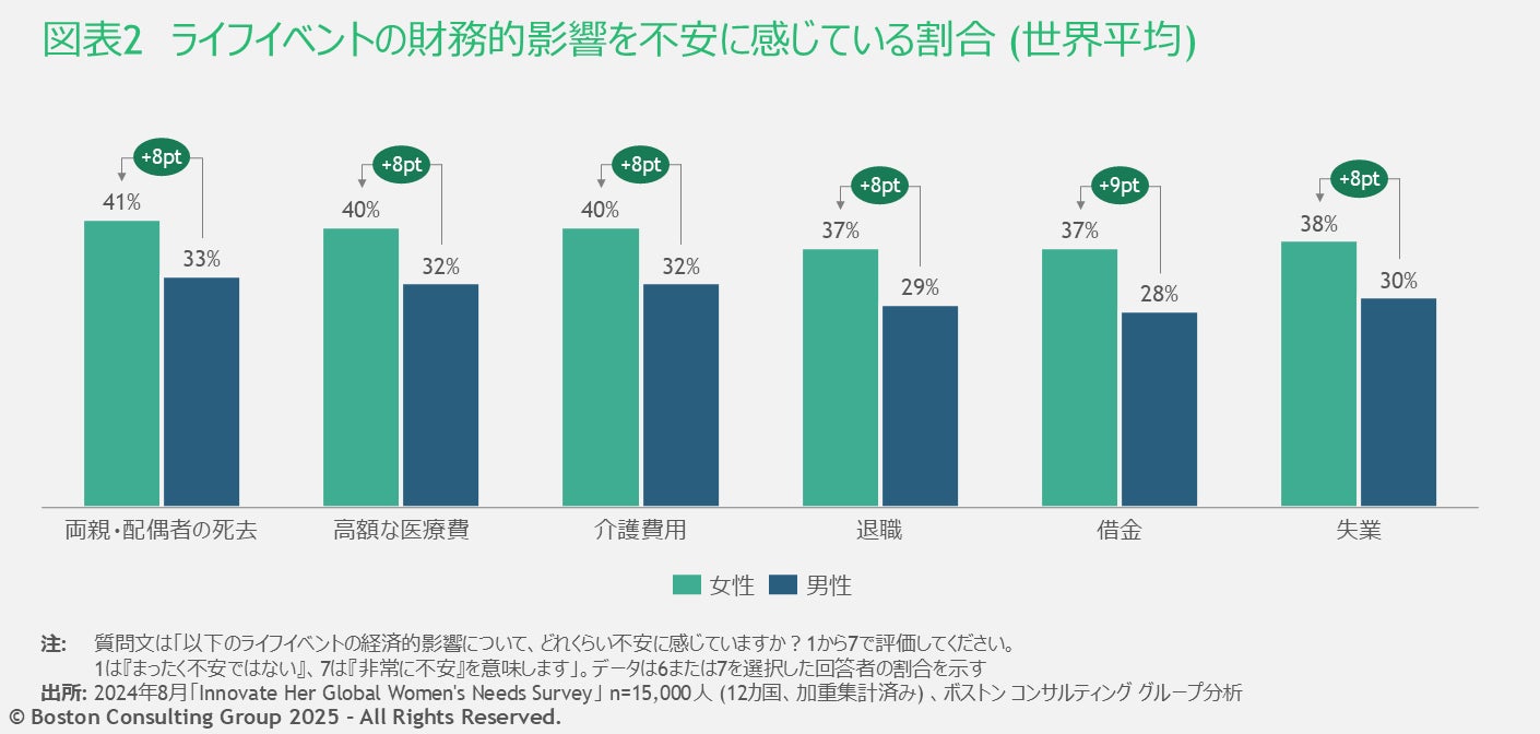 全体的に、女性は男性よりも主なライフイベントが財務に及ぼす影響への不安が大きいことがわかりました(借金は+9ポイント、退職は+8ポイント)。また、懸念事項はライフステージによって異なることもわかっています。Z世代(16~24歳)やミレニアル世代(25~40歳)の女性は失業への懸念が強い一方、X世代(41~56歳)の女性は退職後の計画を、ベビーブーマー世代(57~78歳)の女性は介護費用を最大の心配事としています。ほとんどのステージにおいて、女性は男性よりも財務的な問題に対する不安を強く感じています。