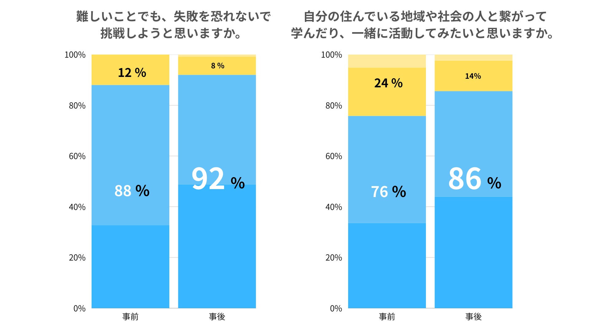 授業後アンケートでは、失敗への向き合い方や、地域・社会との関わり、自身の将来に対する捉え方について、授業前からの前向きな変化が見られました。