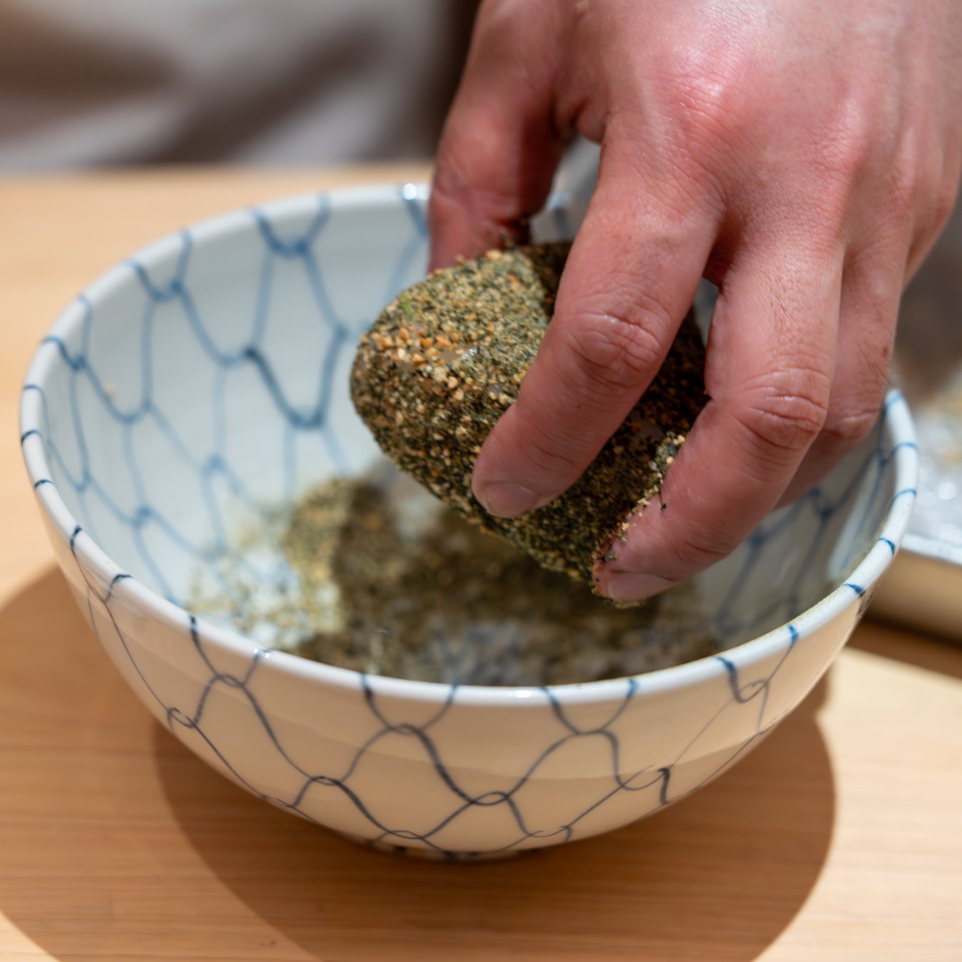 そんな片山シェフのおむすびは「玄米茶とじゃこのおむすび」おむすびの中に入っているのちりめんじゃこは瀬戸内産でお米とのバランスを取るためなるべく細かいものを選びました。山椒とともに甘めに炊かれています。そこに香り高い玄米茶と玄米茶の元となる玄米を細かく砕いたものをまぶして、海苔で包みました。