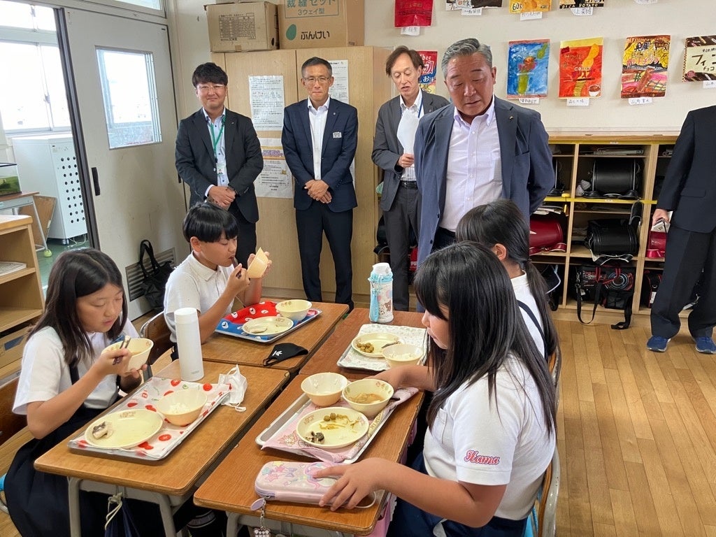 オーガニックビレッジ宣言式後は、旭川市の有機米が提供されている市内の小学校を訪問し、旭川市の生産者から子どもたちへ有機で作られた米の魅力について説明しました。