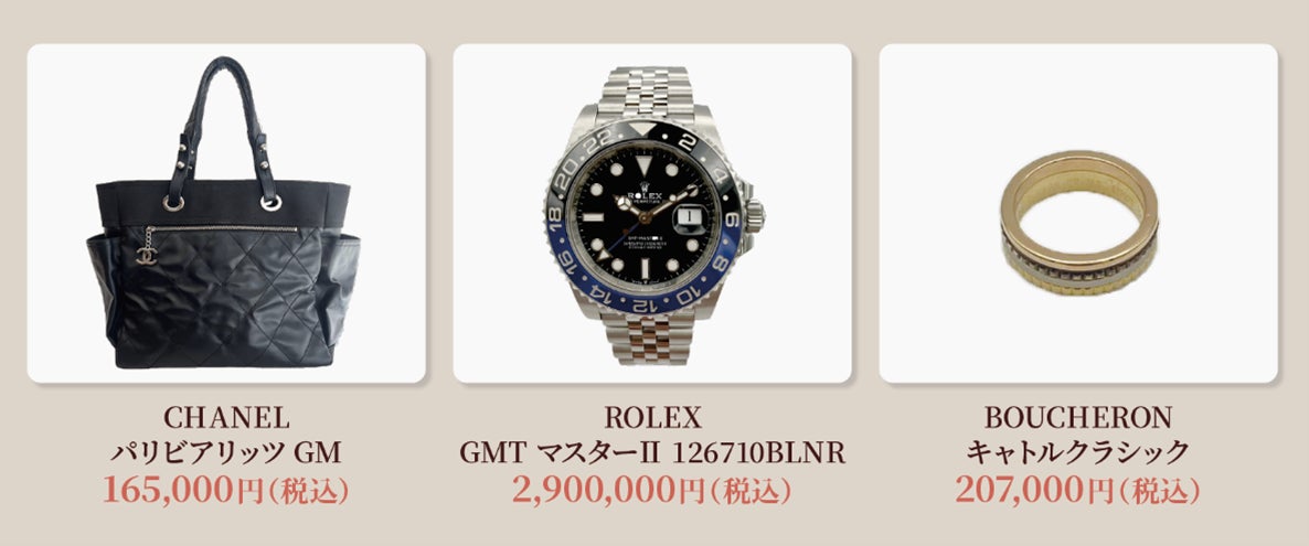 目玉商品として、バッグではCHANEL パリビアリッツ GMが165,000円(税込)、腕時計ではROLEX GMT マスターⅡ 126710BLNRが2,900,000円(税込)、リングではBOUCHERON キャトルクラシックが207,000円(税込)で販売いたします。他にも様々なブランド商品をお買い得価格で販売いたします。この機会にぜひ、運命のモノに出会いにお越しください!
