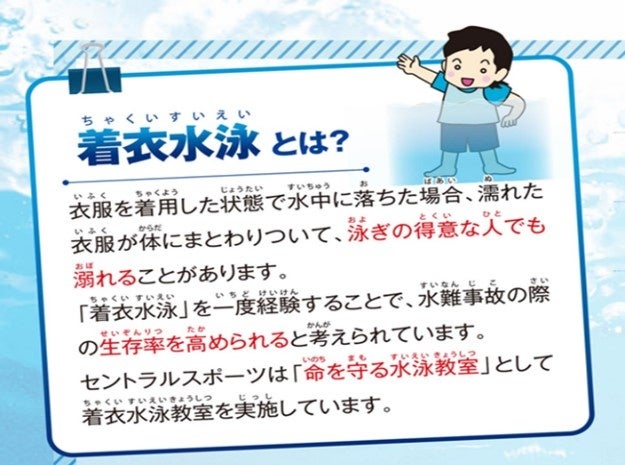 全国約250店舗でスポーツクラブを運営・指導しているセントラルスポーツ株式会社(本社:東京都中央区、代表取締役社長 執行役員 後藤聖治 以下、「当社」)は、公益財団法人日本水泳連盟が使命として掲げられた「健康増進・水辺の安全を目的とした水泳の普及(国民皆泳)活動」に賛同し、健康増進と水辺の安全を目的とした水泳事業を推進してまいります。