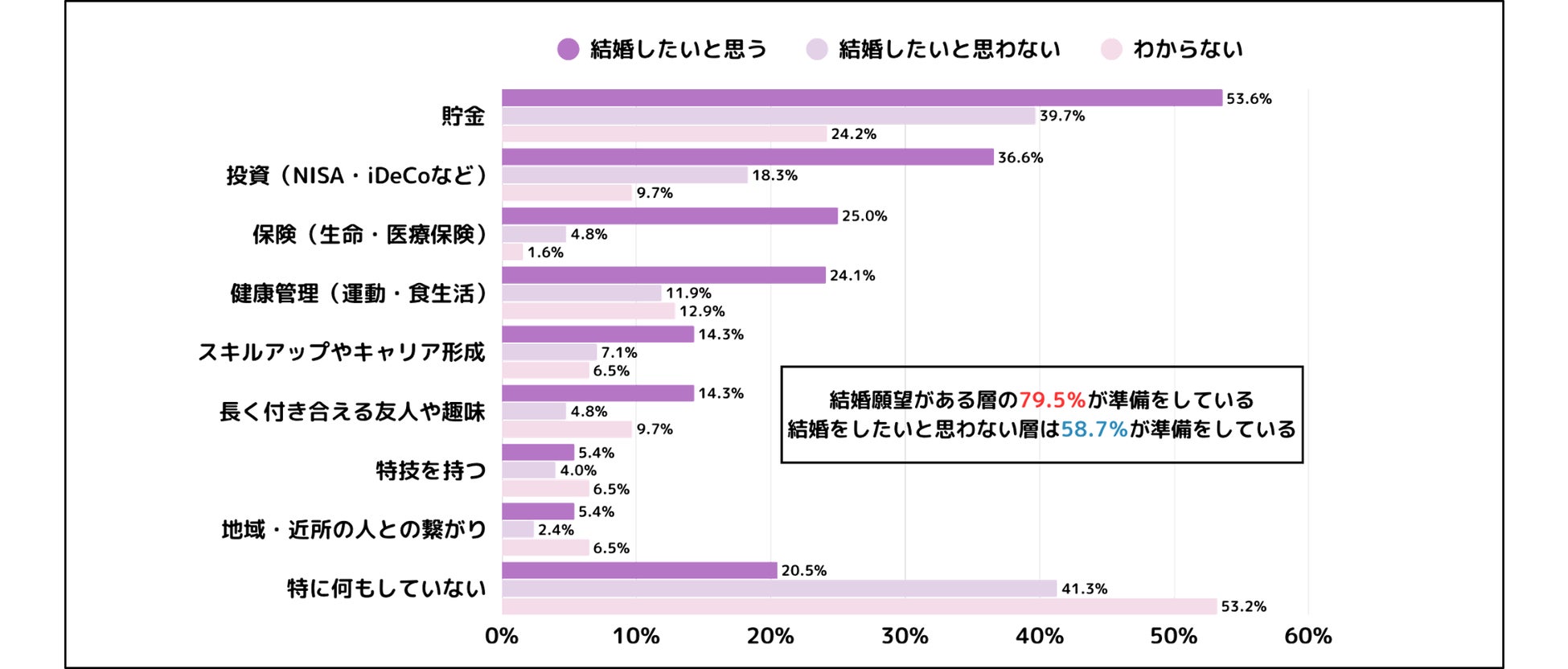 結婚願望の有無に分けて見てみると、結婚願望がある層の79.5%が老後の準備に積極的に取り組んでいると分かりました。一方、結婚をしたいと思わない層で取り組んでいるのは58.7%となり、結婚願望のある方の方が未来を見据えた準備に積極的と推察されます。