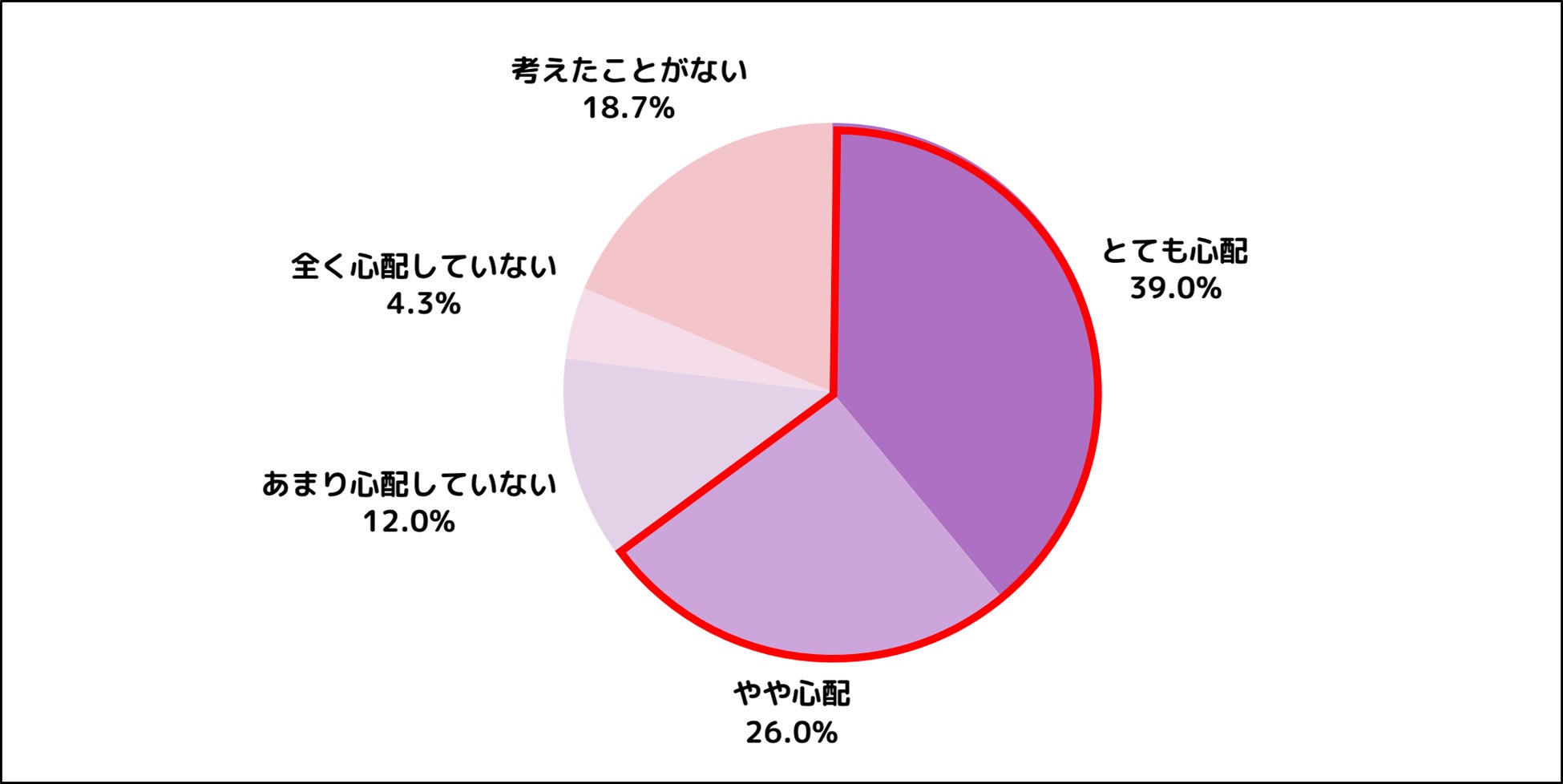 Q5で老後の不安について、経済面が1位であると分かりましたが、老後資金についてどの程度心配に感じているのでしょうか。今回の調査では、6割以上(「とても心配」39.0%、「やや心配」26.0%の合計)が心配してる結果となりました。