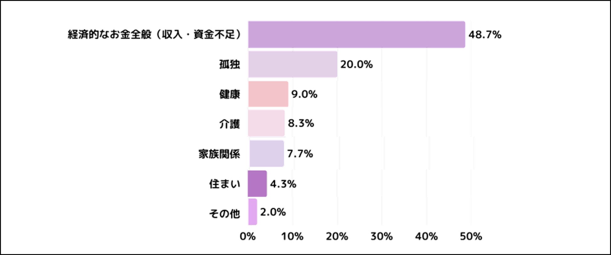 老後の不安として最も大きいものについて訊いたところ、「経済的なお金全般」が48.7%と最も高く、次いで「孤独」が20.0%となりました。Q3の結婚したい理由で上位に挙がった「精神的に支え合える人がほしい」、「経済的に支え合える人がほしい」とも連動するような結果となっています。