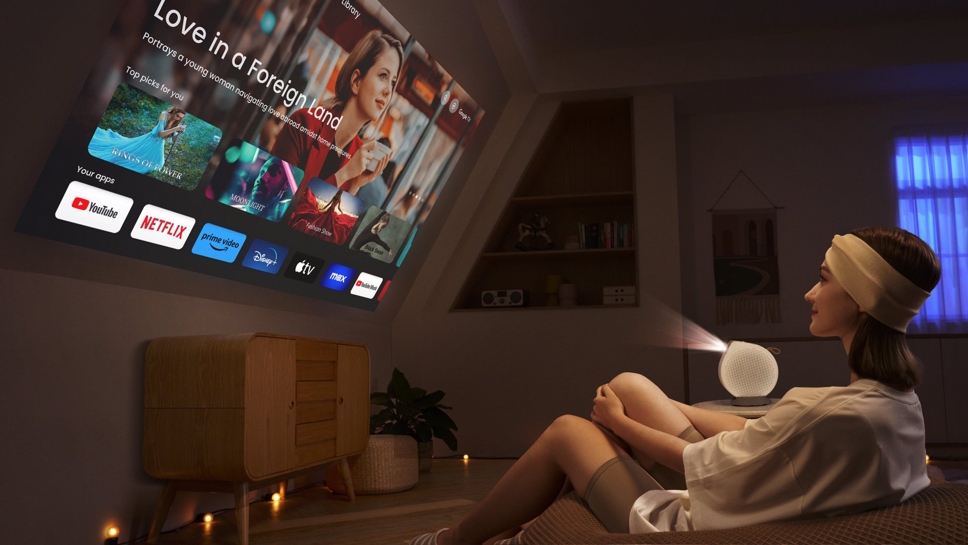 付属の台座に本体を置いて上下にスライドするだけで、壁だけでなくロフトや傾斜のある天井などにも好みの角度で投影可能です。また、従来機種の「GV31」にも搭載されていたオートフォーカスや自動縦台形補正に横と回転補正も加わり、自動障害物回避機能にも対応しています。さらに、スリープタイマーや目の疲れを軽減させるナイトシフトモードなどの機能を備え、寝室での使用に最適なモデルとなっています