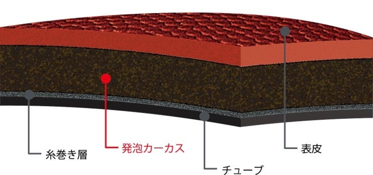 表皮と糸巻き層の間にあるカバーゴム層に、微細な空気を組み込む発泡カーカスを採用しています。