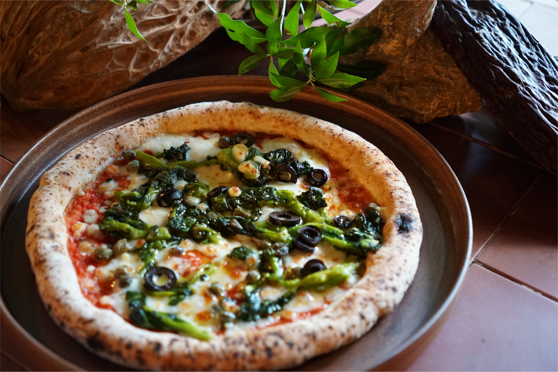 信州産の菜の花のほろ苦さと香りを、軽やかなチーズと薄焼きの生地が引き立てる味わい深い一枚。