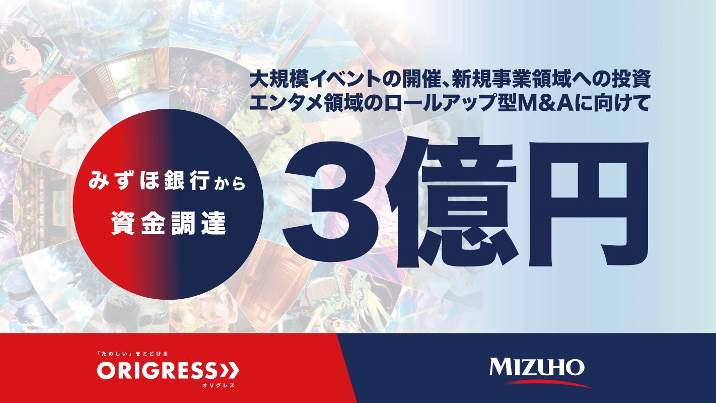日本最大級かつ唯一無二(※)のリアルエンターテイメントの総合商社である株式会社オリグレス(代表取締役社長 吉武優)は、この度、みずほ銀行より融資での3億円の資金調達を行いました。