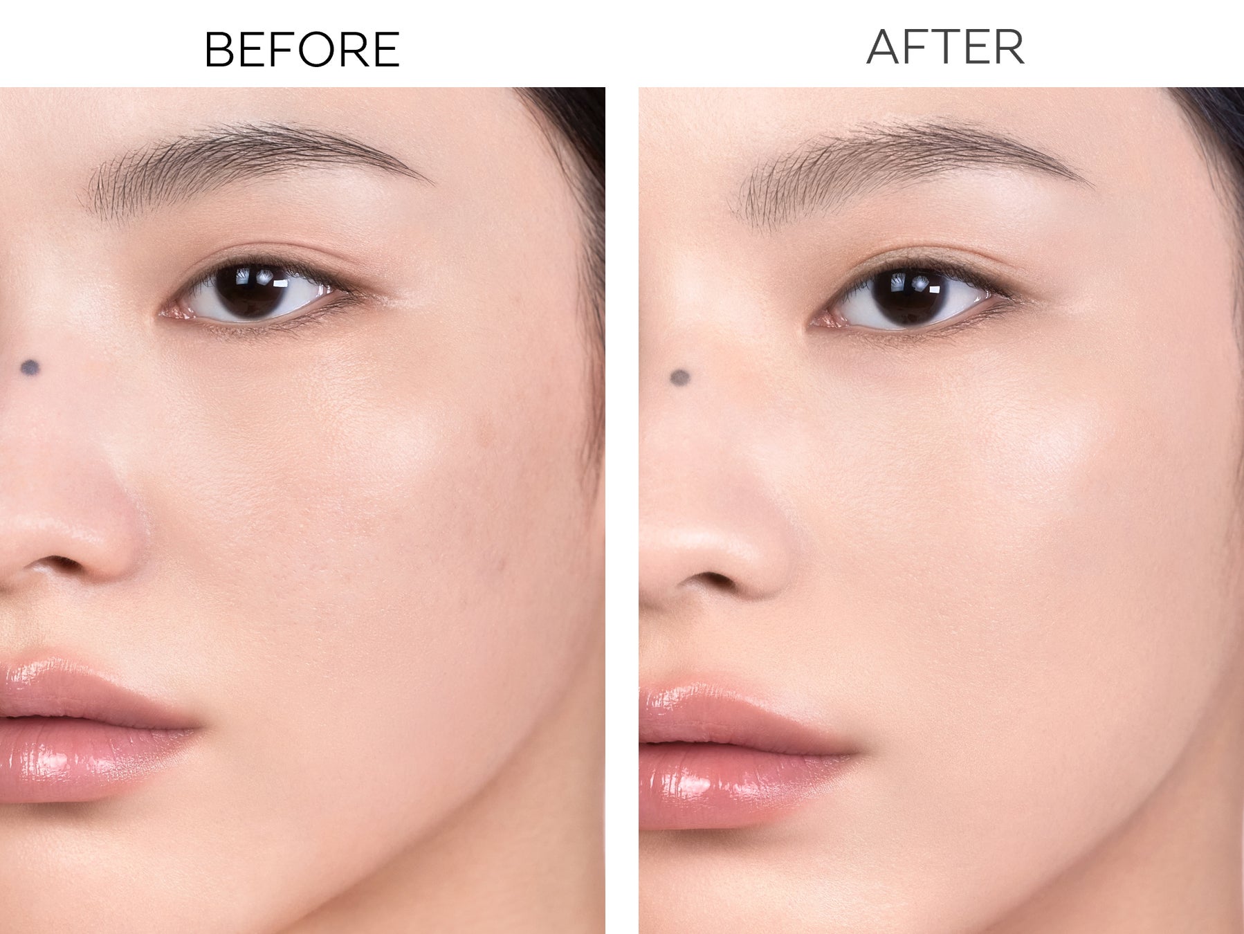 美容液成分82%*¹配合の本製品は、みずみずしいのにべたつかず、肌にのせた瞬間、スーッと馴染んで密着。毛穴・クマ・シミを均一にカバーしながら、薄く軽いセミツヤの素肌仕上がりを夜まで*²キープします。重ね塗りしても厚塗り感が出ず、お直しも簡単。自然なワントーン明るい肌*³を演出し、UVカット効果も備えています。