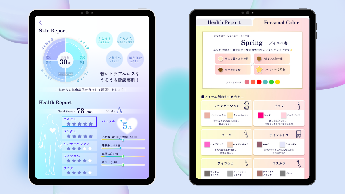 30秒の動画を撮影するだけで、心拍数・呼吸数・血圧をはじめとする23項目の健康指数に加え、肌の水分量・油分量、赤みやシワ、肌年齢などの肌状態を同時に高精度で解析・表示できるアプリケーションです。美容・健康商材を取り扱う店舗や、ジム・温浴施設など、幅広い健康増進の現場で導入が進んでいます。