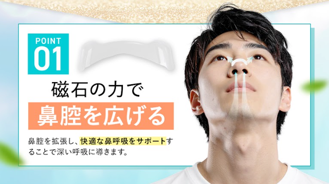 本製品は、鼻に貼るだけで鼻腔をやさしく拡げ、睡眠中の口呼吸を効果的に抑制。鼻呼吸を促すことで、睡眠の質の向上やいびきの軽減をサポートします。