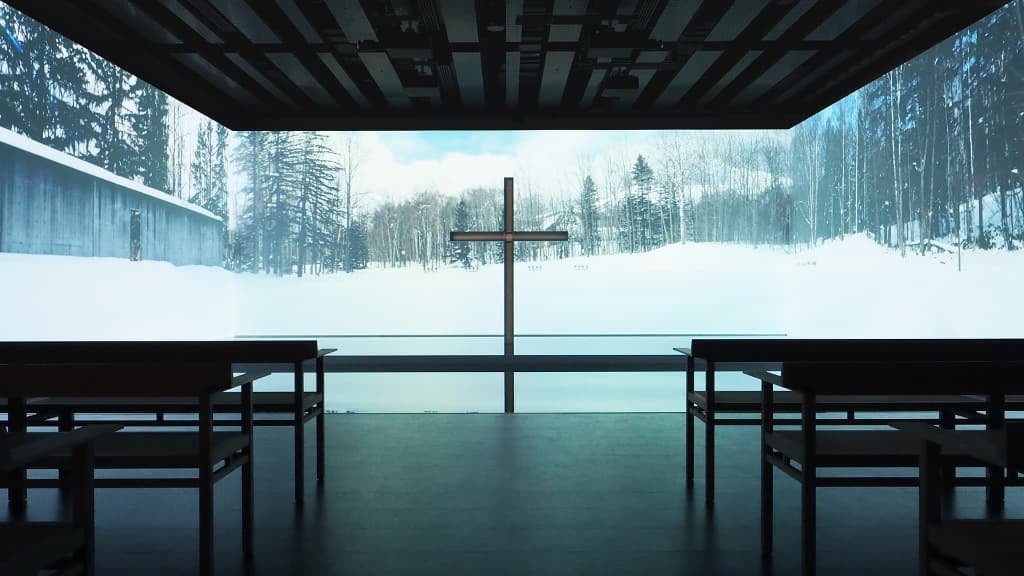 インスタレーション「水の教会」は、安藤忠雄氏の初期代表作にして、教会3部作のひとつ。原寸大で再現されています。北海道の雄大な自然を背景として水上に十字架が浮かぶ情景を、パノラマ映像と、実際に水を張った水盤でリアルに再現することで、遠く北海道の建築空間を会場で体感することができます。季節や時間帯ごとの光の変化を味わいながら、あなただけの写真をぜひ撮影してみてはいかがでしょうか。