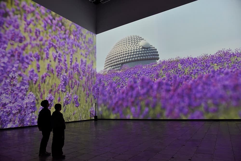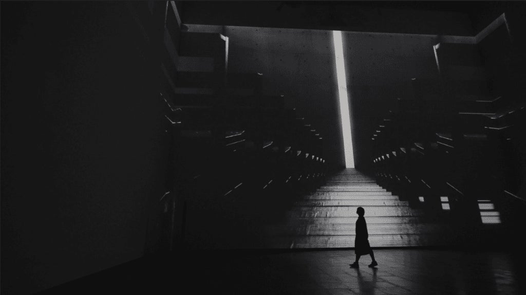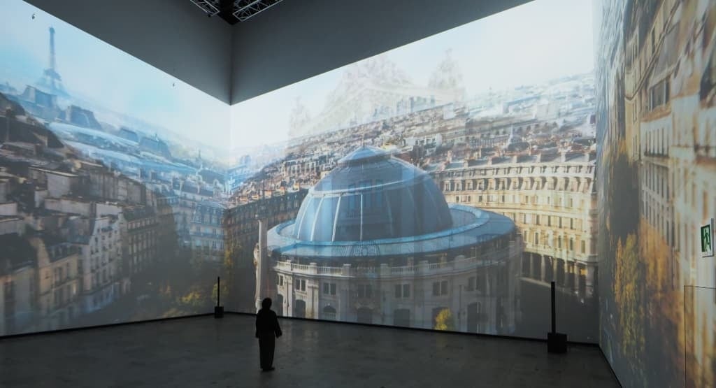 映像インスタレーションでは、安藤忠雄氏の建築を象徴する三作品「光の教会」「真駒内滝野霊園頭大仏」「ブルス・ドゥ・コメルス」の空間を、天井高15mのキューブ型スタジオの3面に展開するオリジナルの没入型映像で疑似体験することができます。スタジオでお気に入りのポジションを見つけて、時間を過ごしてみてください。動画撮影もおすすめです。