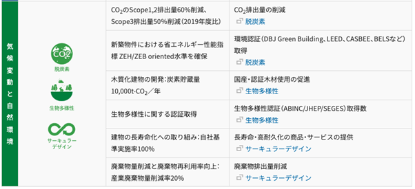 60%削減、Scope3排出量50%削減(2019年度比)」や「新築物件における省エネルギー性能指標