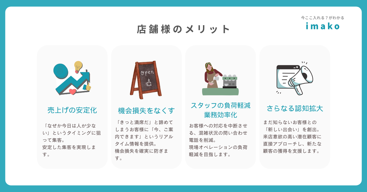 事業内容: カフェ混雑情報プラットフォーム「imako」の企画・開発・運営