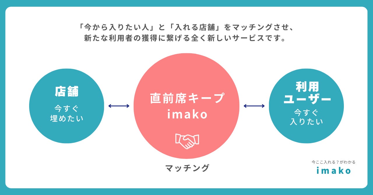 「直前席キープ」は、ユーザーがimakoアプリから気になるカフェを選び、簡単な操作で席を15分間確保できるサービスです。予約システムとは異なり、リアルタイムの空席状況に応じて利用できる点が特徴で、既存の予約システムとも併用可能です。
