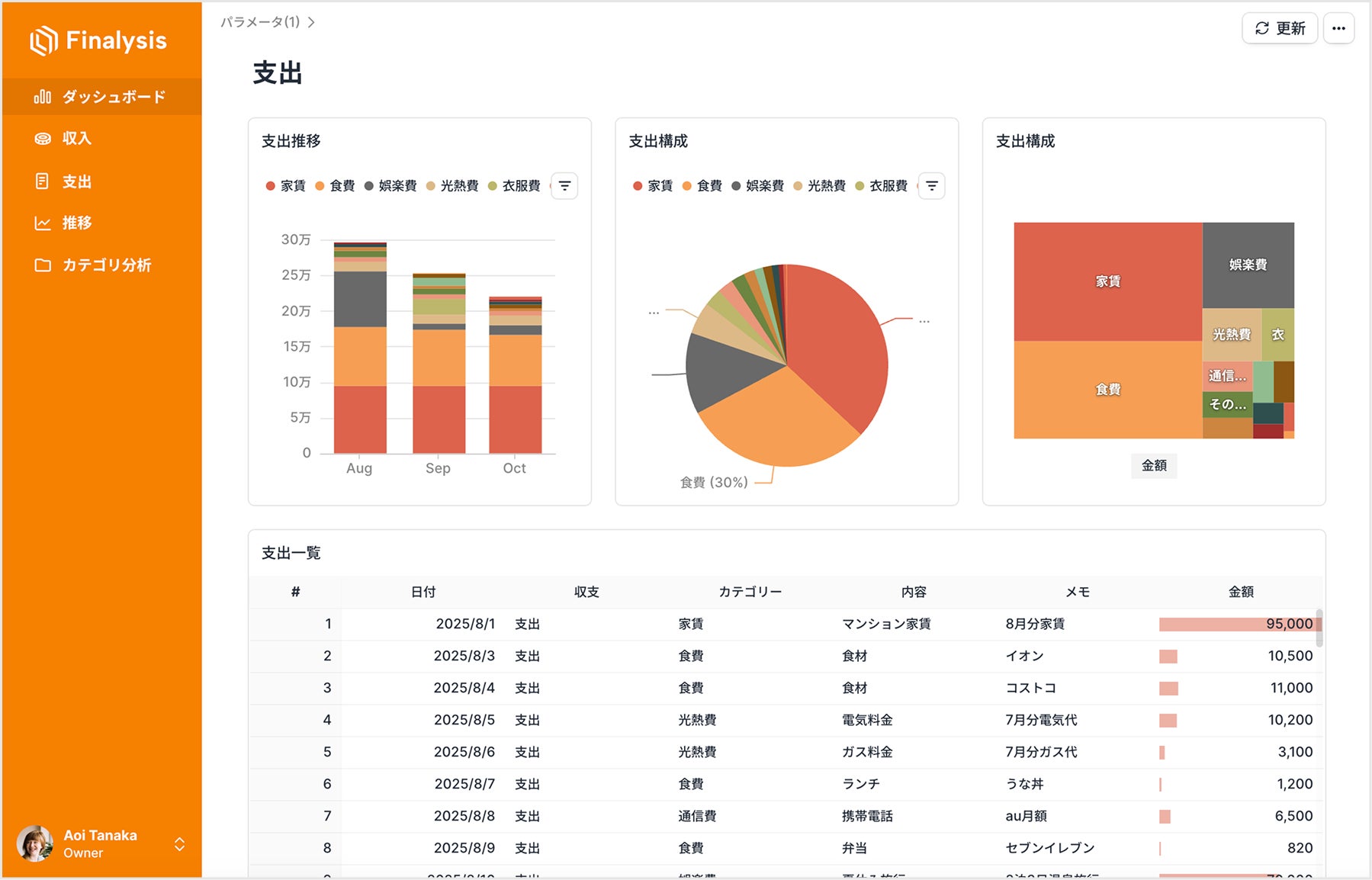 個人データをアプリ内で表示し、収入や支出をダッシュボードで直感的に確認できます。