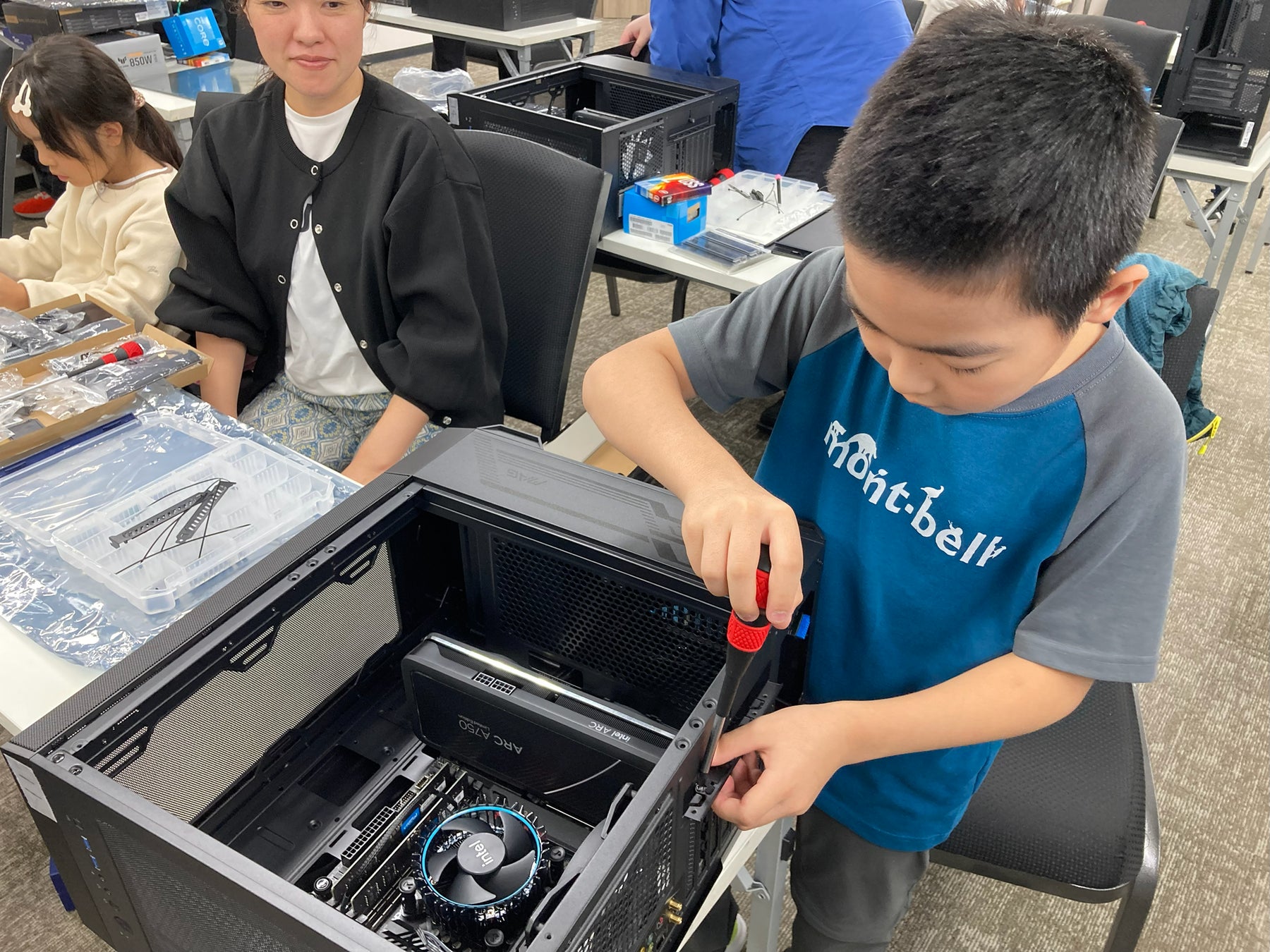 PCのパーツの知識や組立技術を学ぶワークショップです。金曜日は中級者向け、土曜日は初心者向けのコースです。