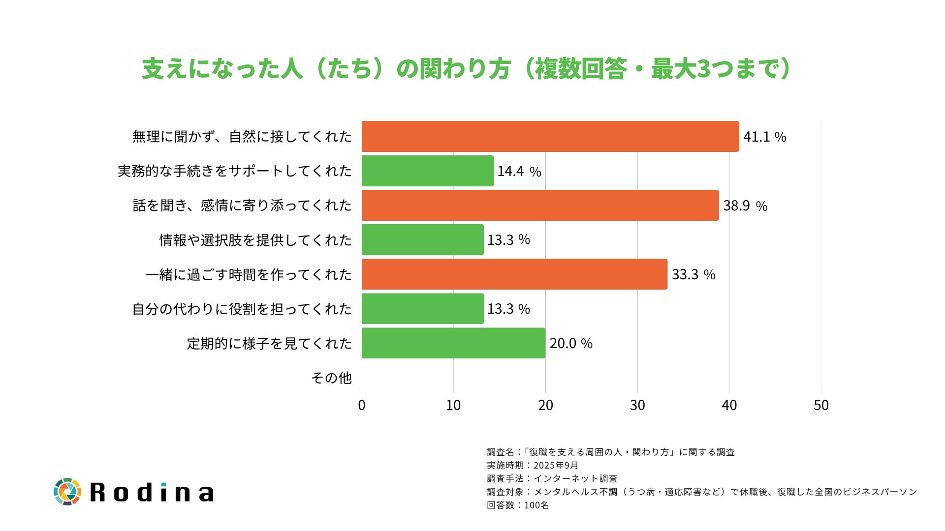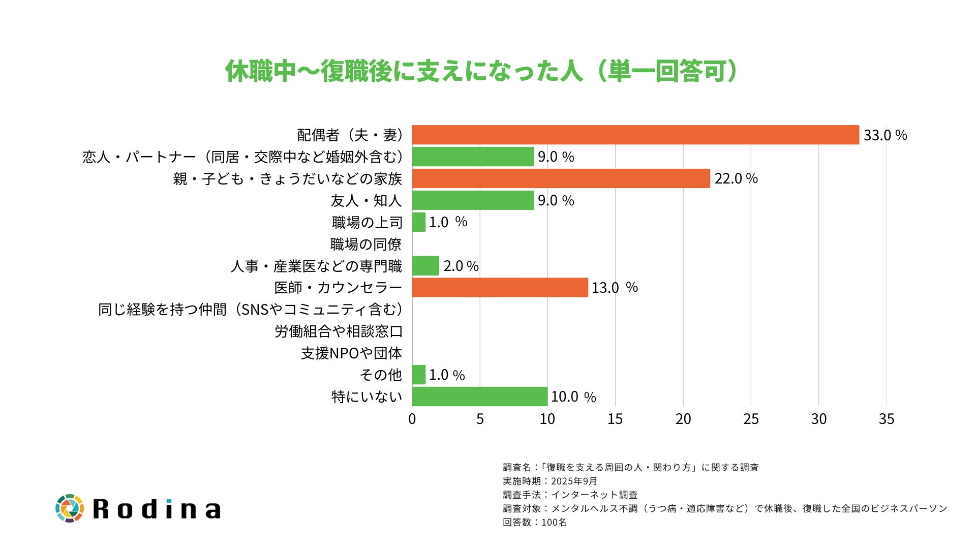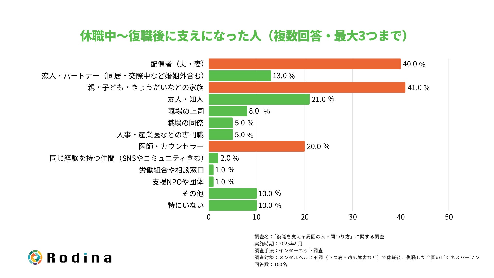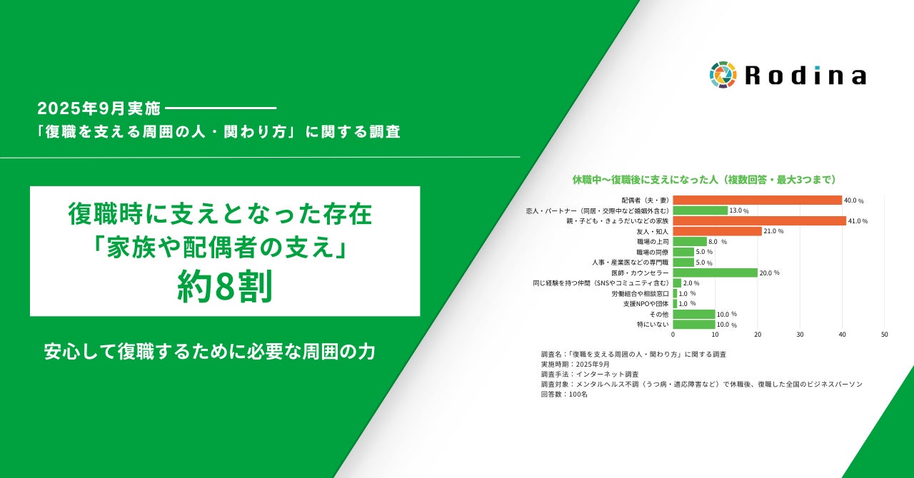 復職・就職支援をおこなう株式会社Rodina(本社:広島県広島市、代表取締役:山田 康輔)は、メンタルヘルス不調(うつ病、適応障害など)により休職を経験し、復職を果たした全国のビジネスパーソン100名を対象に、「復職を支える周囲の人・関わり方」に関する調査を実施しました。その結果、復職者の約8割が家族や配偶者の支えを実感しており、特に配偶者の役割の大きさが浮き彫りになりました。