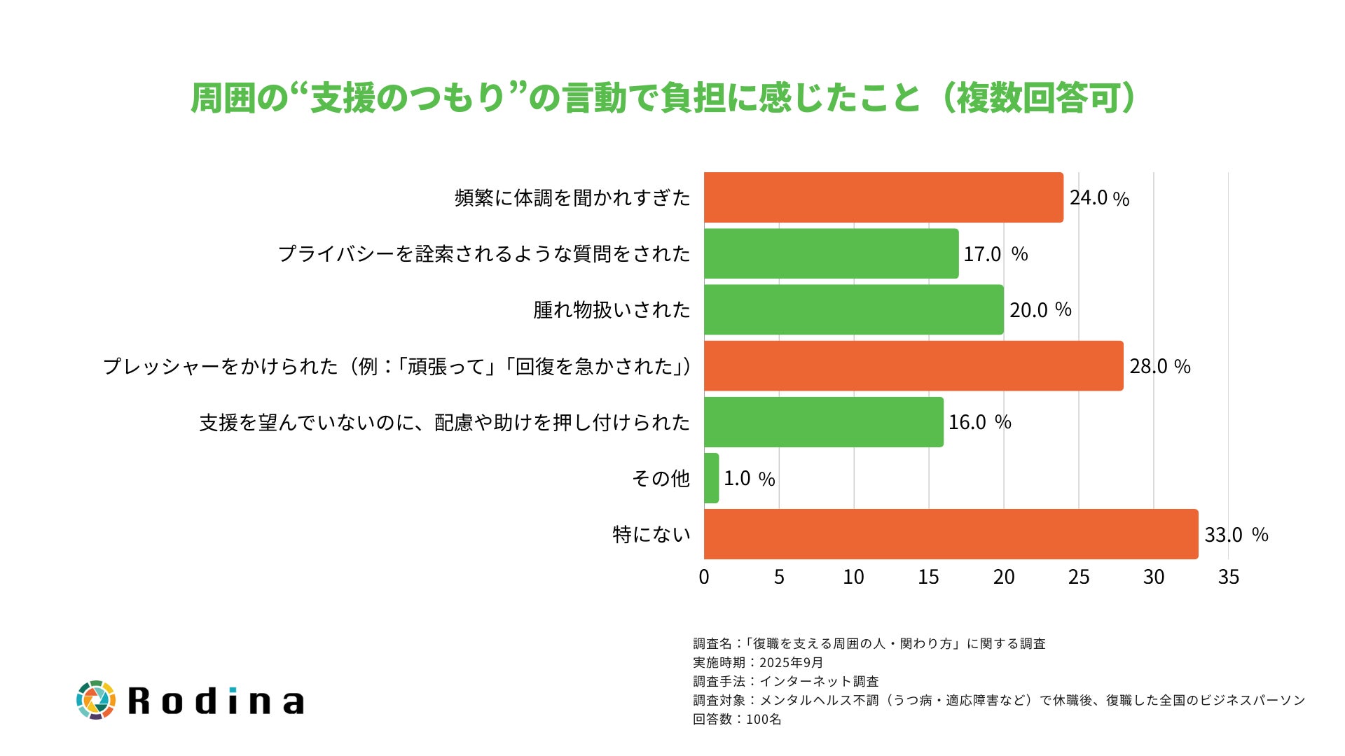 周囲からの“支援のつもり”の言動で負担に感じたこととしては以下が挙げられました。
