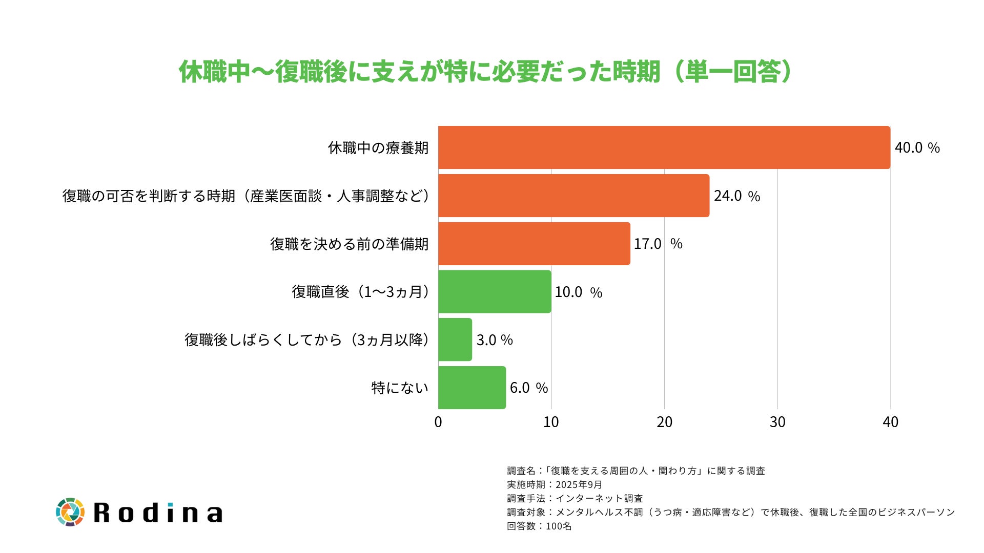 ・支えが必要だった時期のトップは「休職中の療養期」(40%)、次いで「復職可否の判断期」(24%)