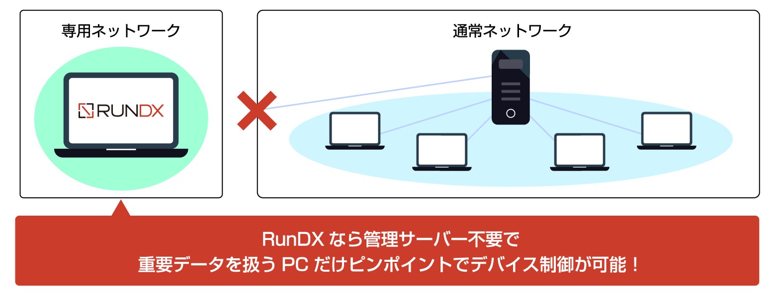 RunDXは管理サーバーを必要とせず、マイナンバーカード関連業務など、専用ネットワークで利用するPCだけを対象にピンポイントでデバイス制御を行えます。
