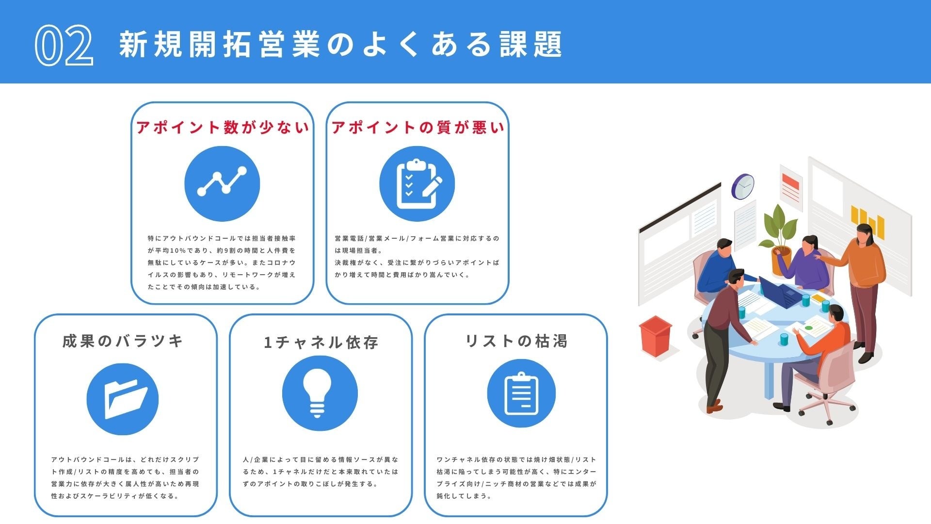 しかし、飛び込み営業やテレアポ、問い合わせフォーム、メール営業といった方法では決裁者に接触することが難しいのが実態です。そのため、「新規開拓営業は受注に繋がりづらく、効率が悪い」「そもそも、シンプルな営業スタイルではアポイントすら獲得が難しい」「営業代行会社に依頼すると、費用対効果が合わない」といった、課題を感じている方が多いのではないでしょうか。