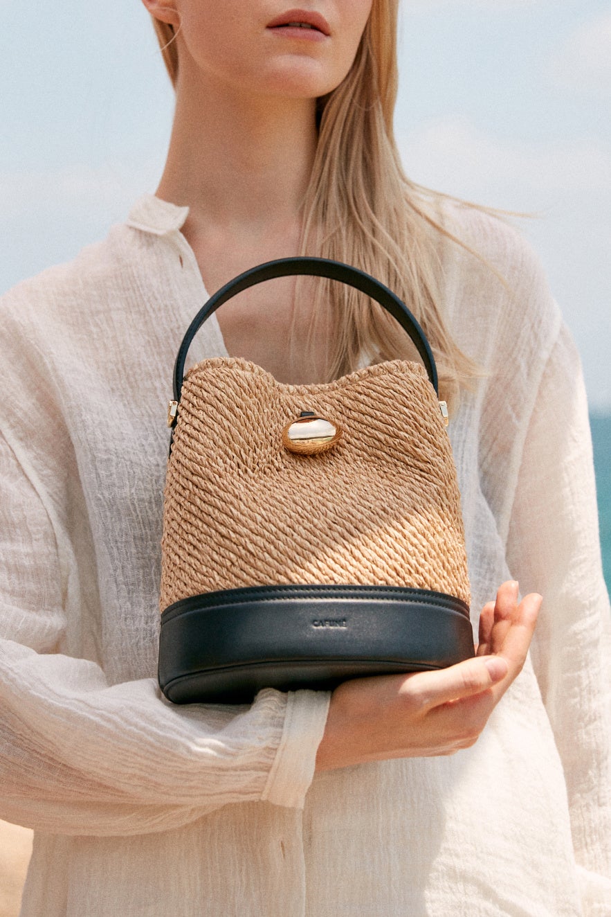 繊細に編み込まれたラフィア素材は、柔らかな手触りと丈夫な使用感を両立。バケットバッグの自然な曲線をレザートリムが引き立て、洗練された雰囲気を醸し出す、夏にぴったりのバッグです。
