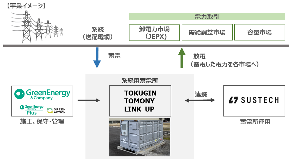 本事業は、株式会社グリーンエナジー&カンパニー(徳島県板野郡松茂町、代表取締役社長:鈴江 崇文)の100%子会社である株式会社グリーンエナジー・プラス(東京都港区、代表取締役:竹村 敏之)が系統用蓄電池設備の施工を担い、日本国内メーカーである株式会社パワーエックス(岡山県玉野市、取締役 代表執行役社長CEO:伊藤 正裕)製の蓄電池システムを用いた系統用蓄電池設備(出力1,990kW/容量8,226kWh)を導入するものです。完成後は、株式会社Sustech(東京都港区、代表取締役:丹野 裕介・飯田 祐一郎)がアグリゲーターとして運営を担当し、国内の卸電力市場、需給調整市場、容量市場において、電力の需給バランスの調整や電力市場への最適な電力供給を行います。